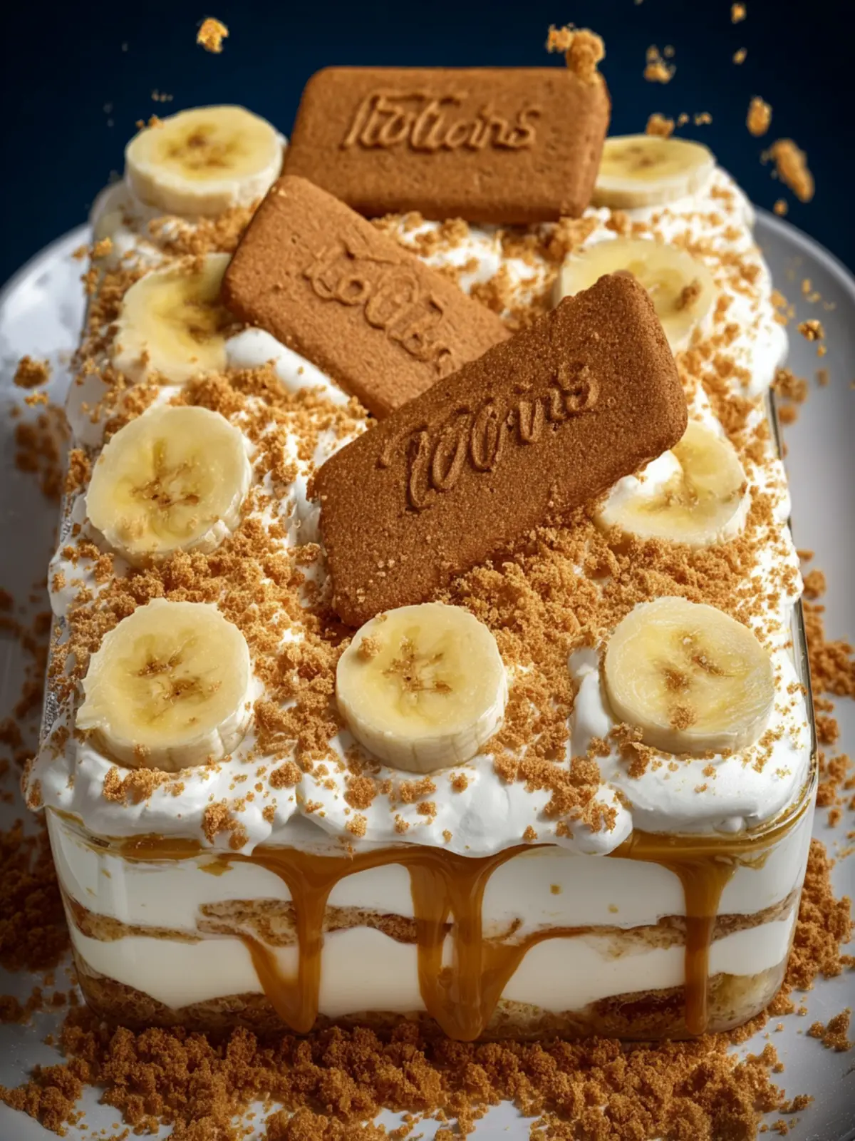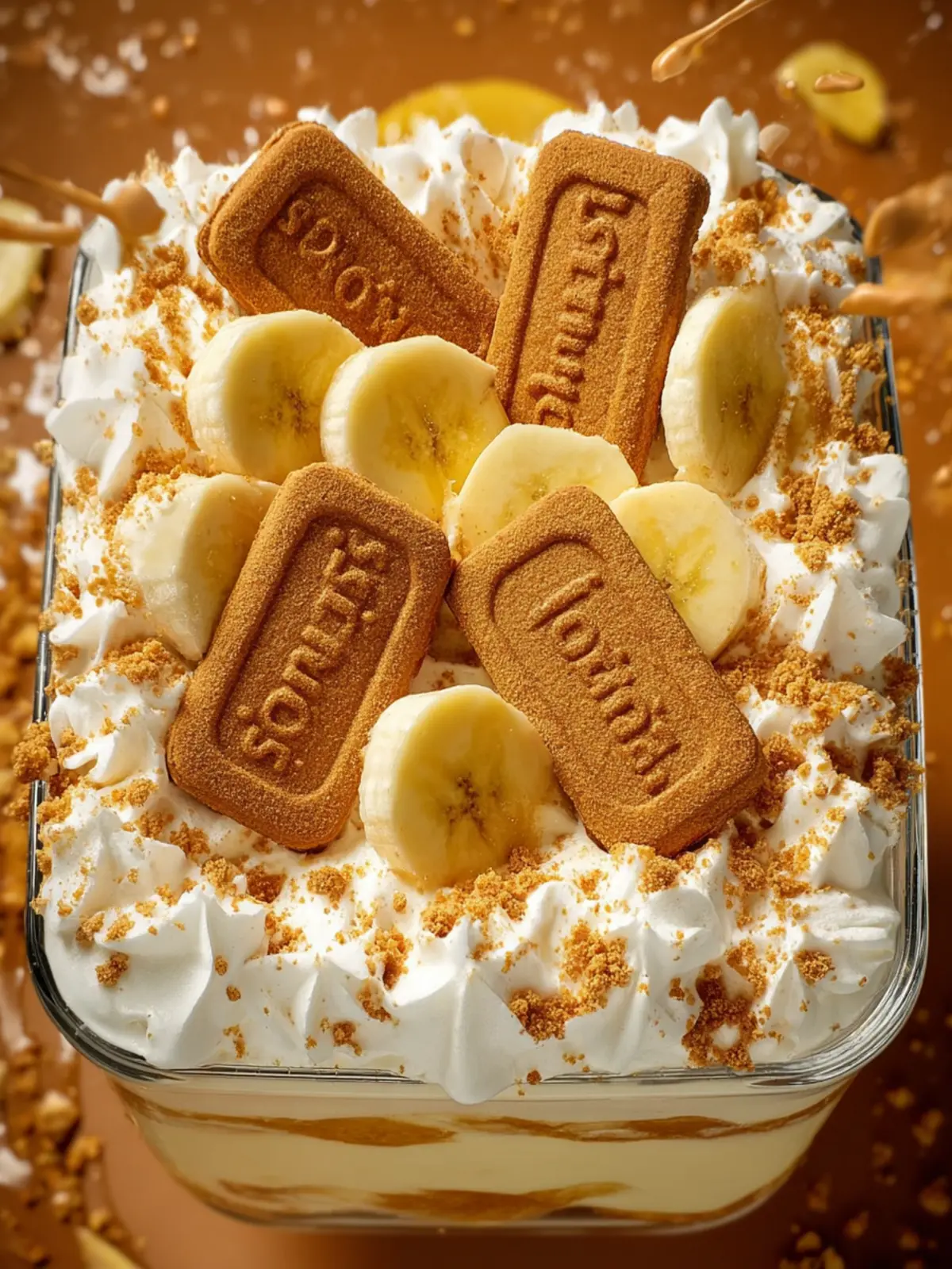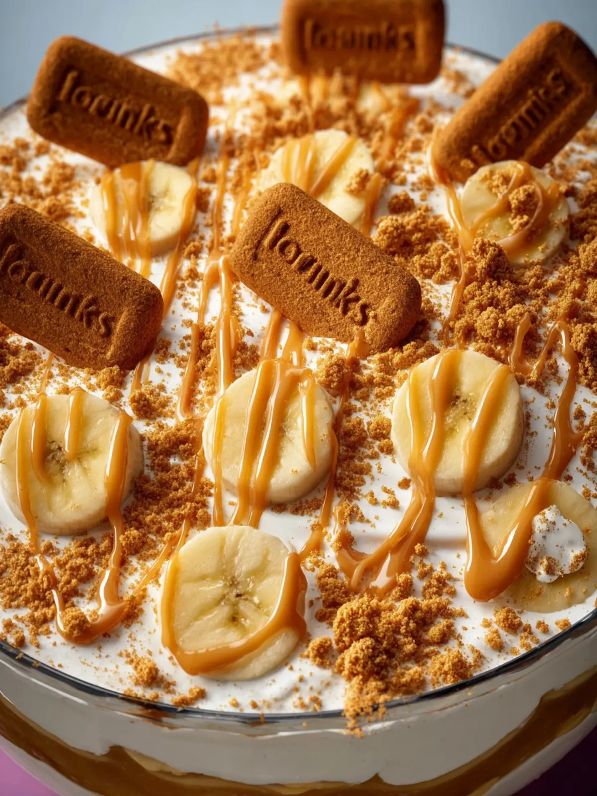 - Add a final layer of pudding and drizzle the remaining smooth Biscoff butter on top. Sprinkle the remaining crushed cookies and the remaining sliced bananas. Add cookies throughout to decorate the pudding.