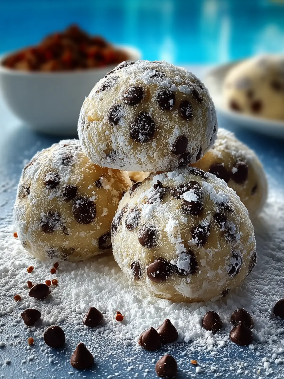 Delicious mini chocolate chip cookies rolled in powdered sugar, perfect for any occasion!