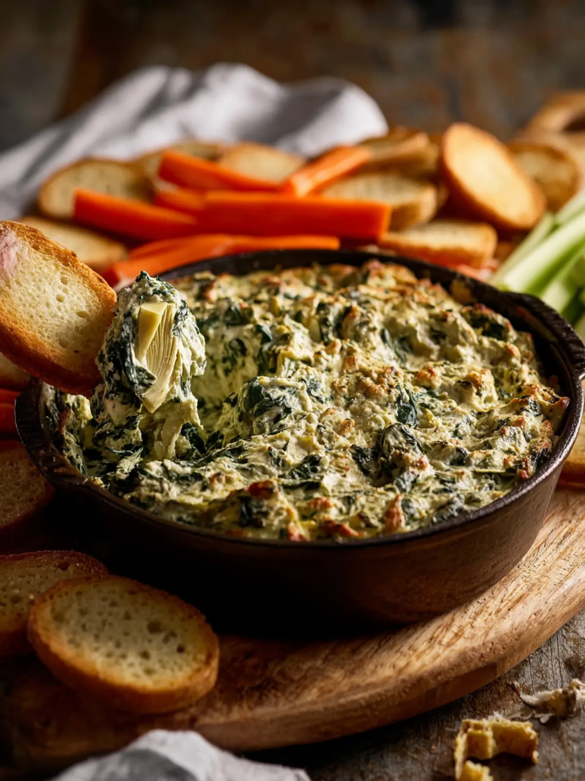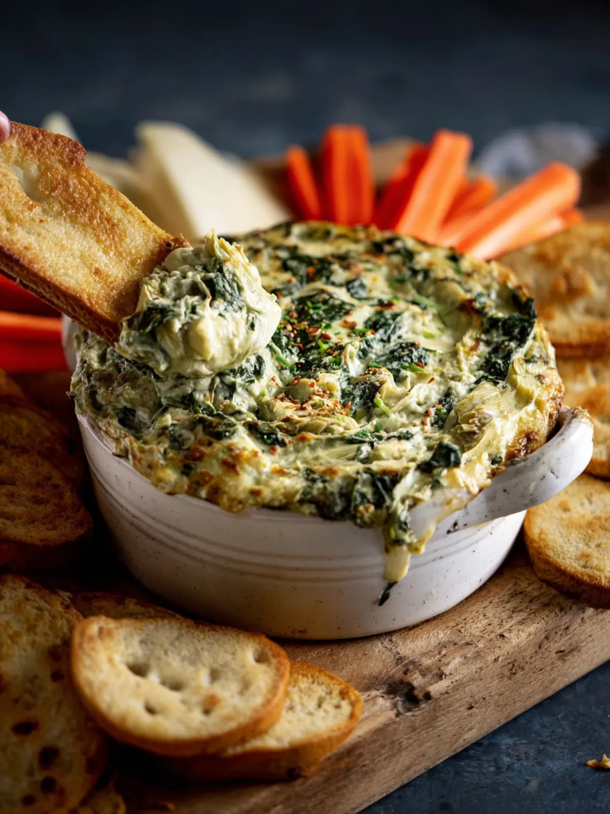 - Crispy Tortilla Chips: Their sturdy texture is great for scooping up your creamy spinach artichoke dip.