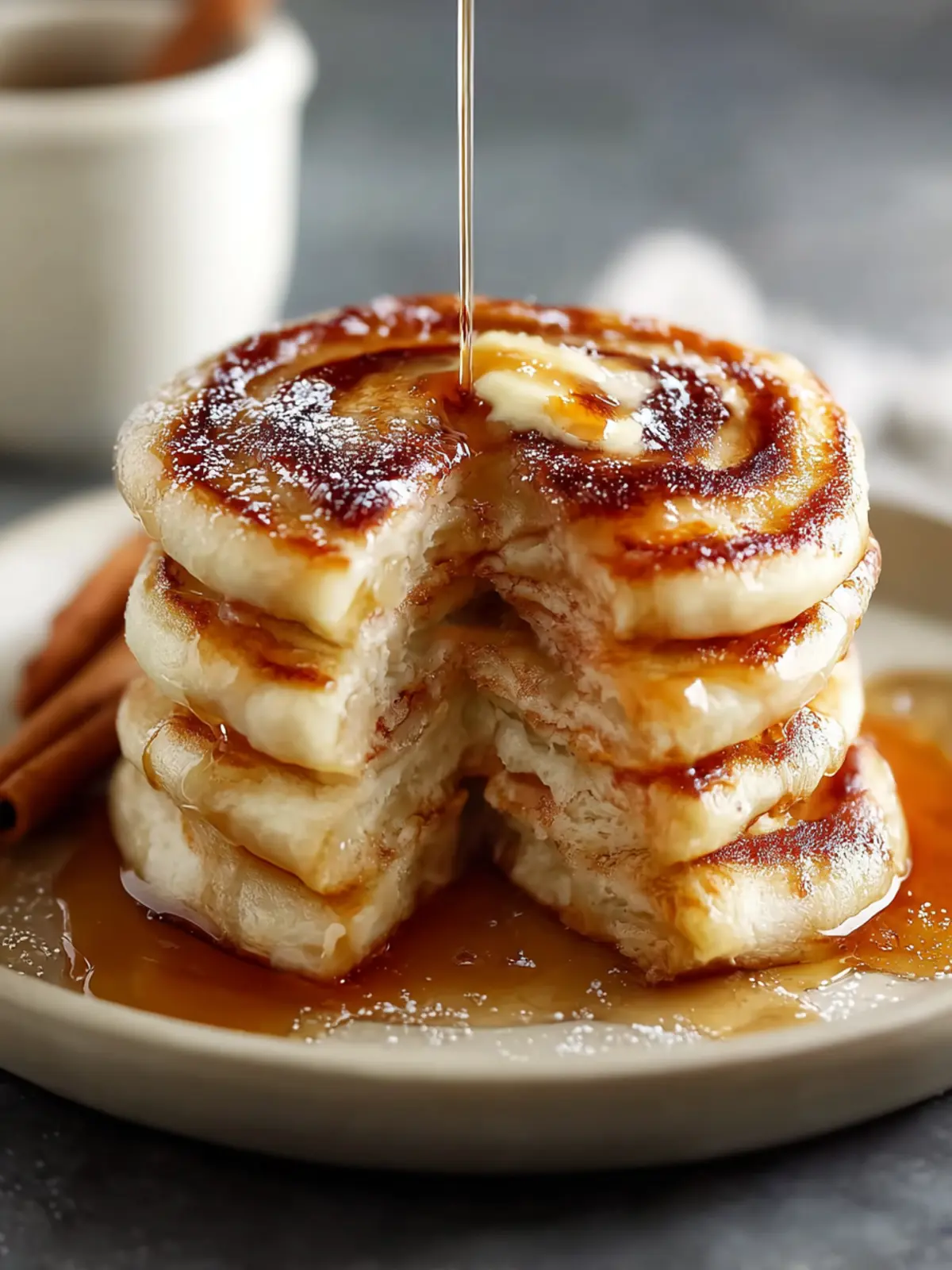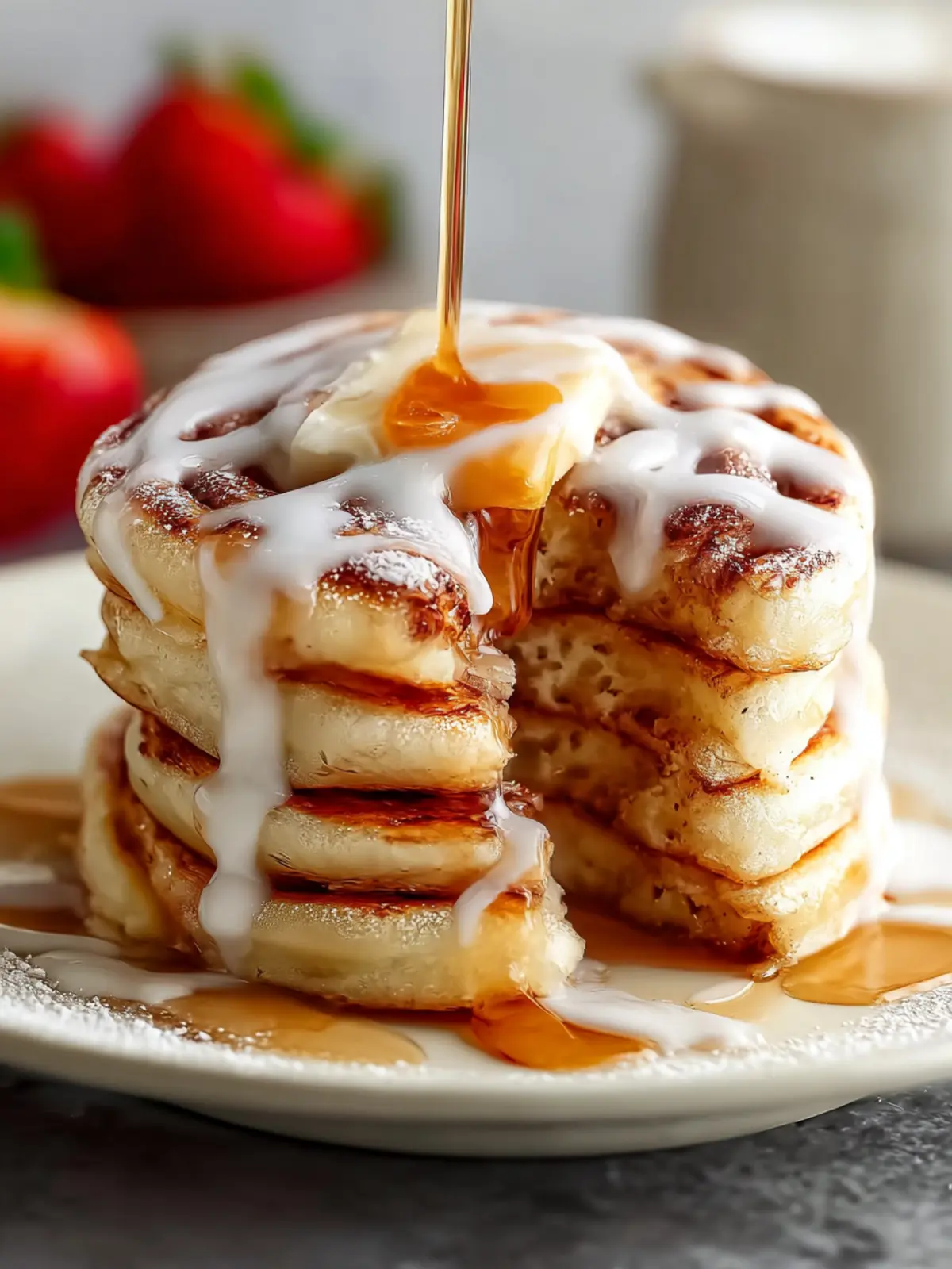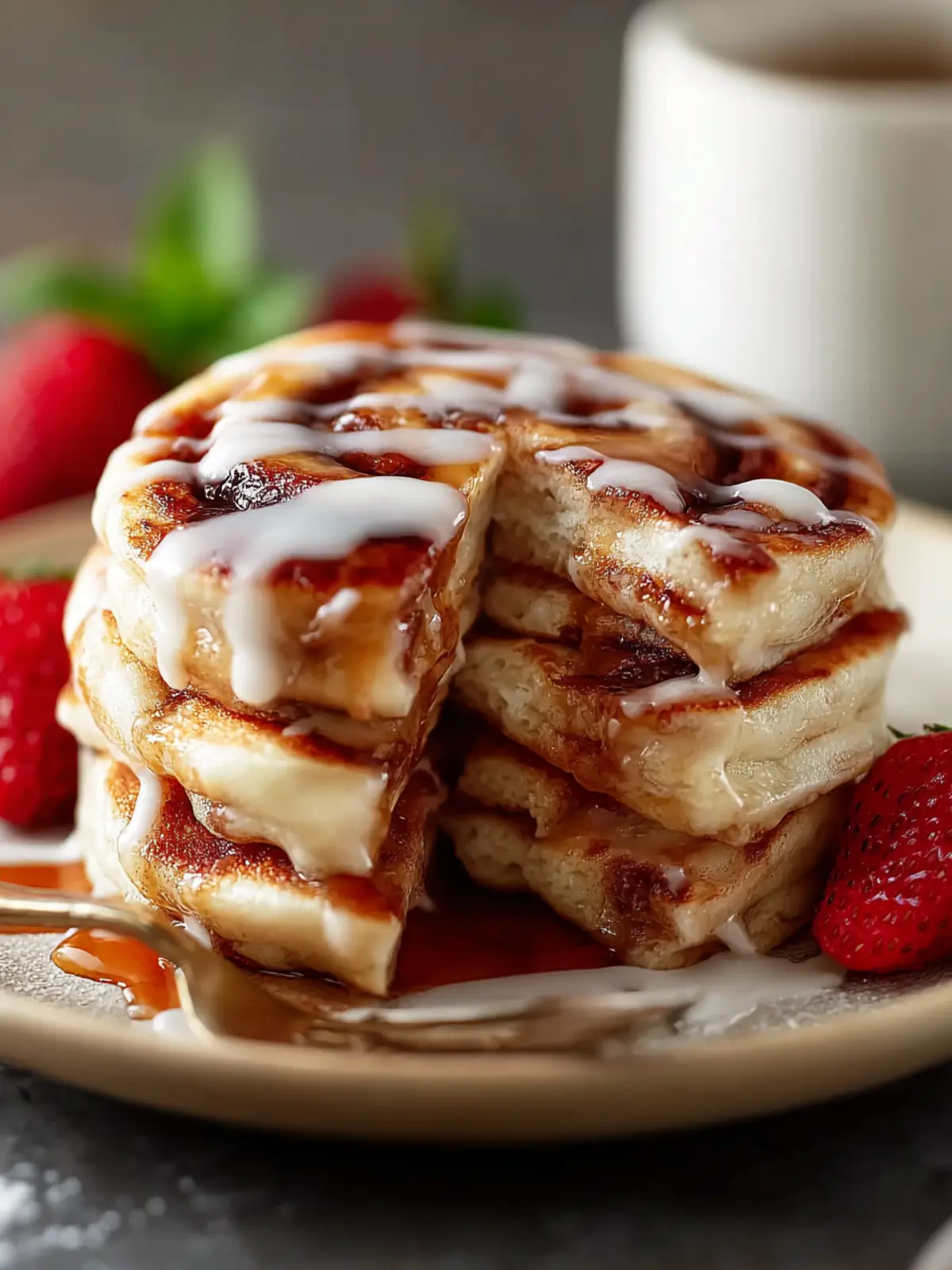 Delicious, fluffy pancakes swirled with a cinnamon filling and topped with a creamy glaze.