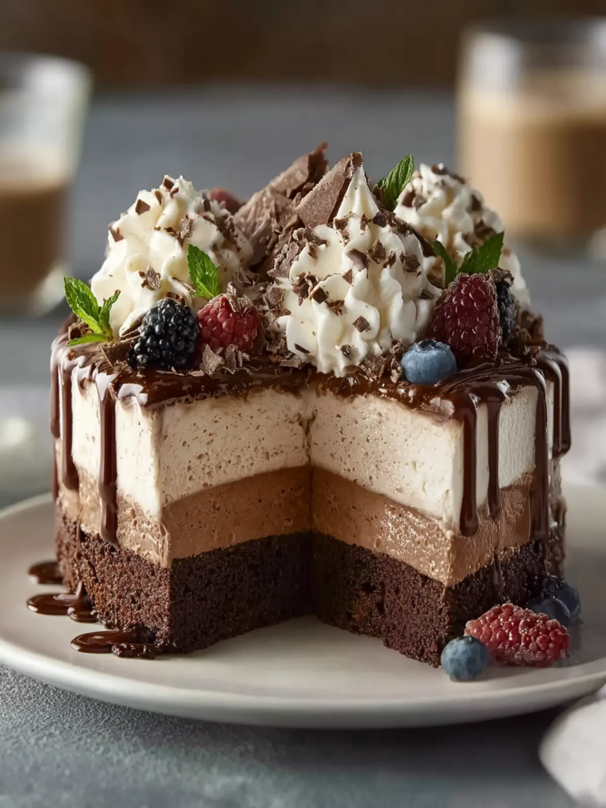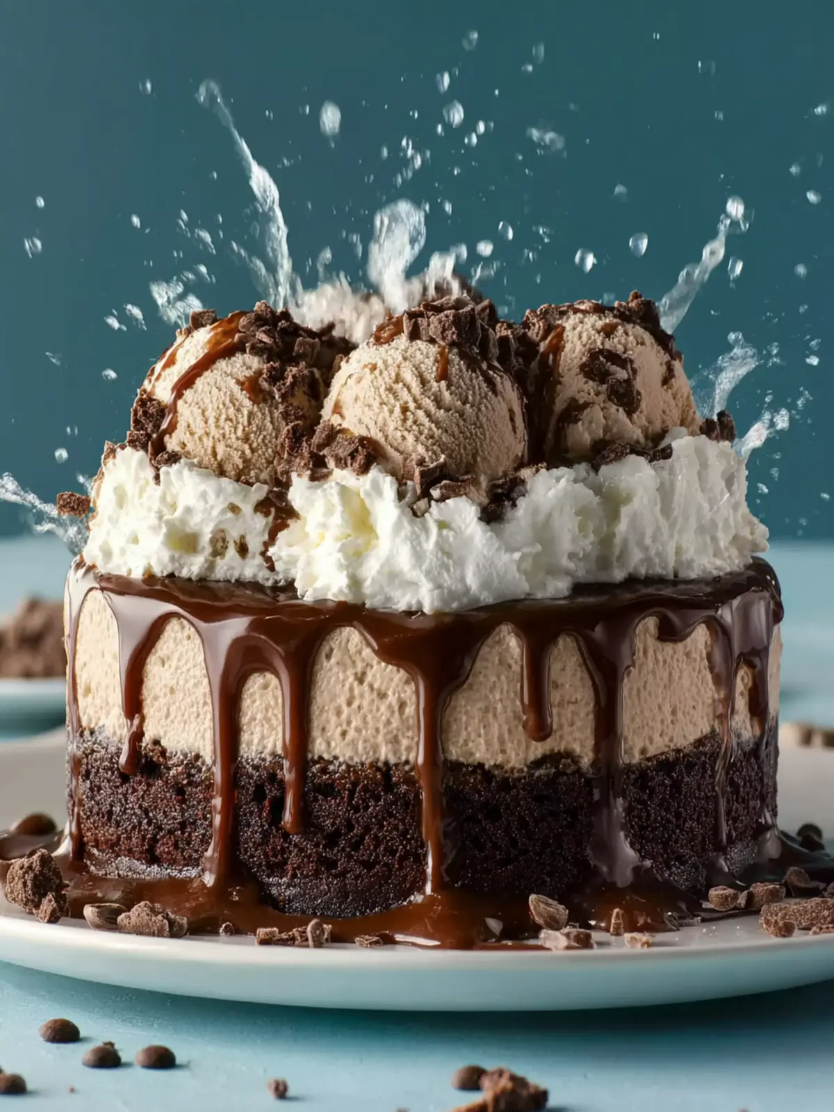 This decadent Mocha Brownie Ice Cream Cake features a rich brownie layer, creamy coffee ice cream, and a smooth chocolate ganache topping, perfect for any dessert lover.