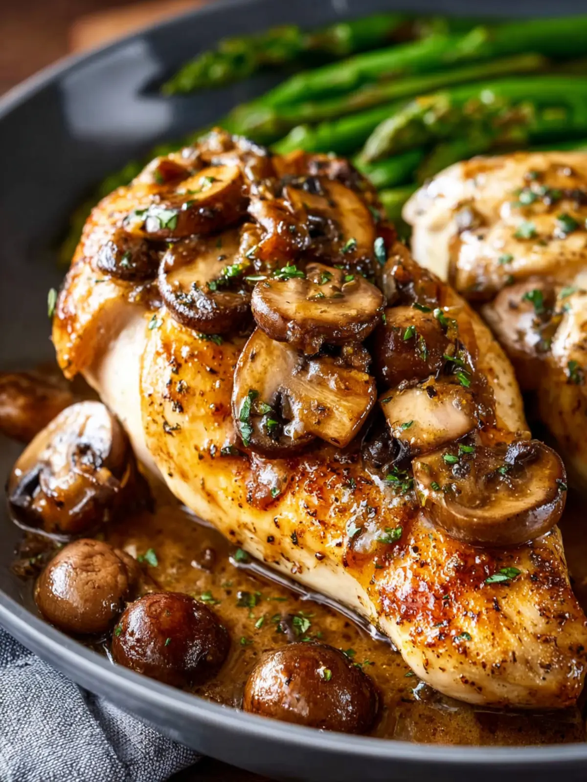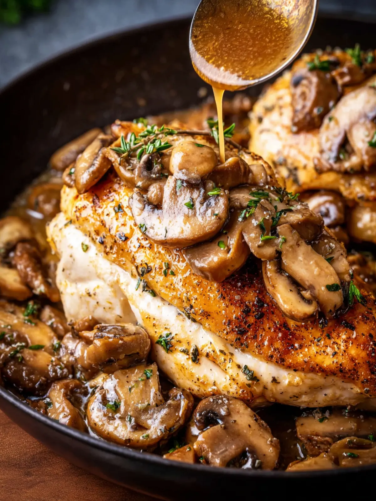 - Return the stuffed chicken to the pan and nestle it into the mushroom sauce.