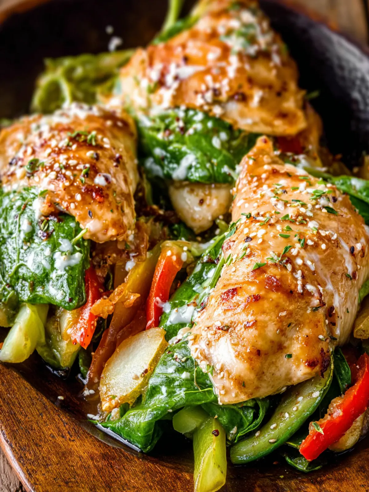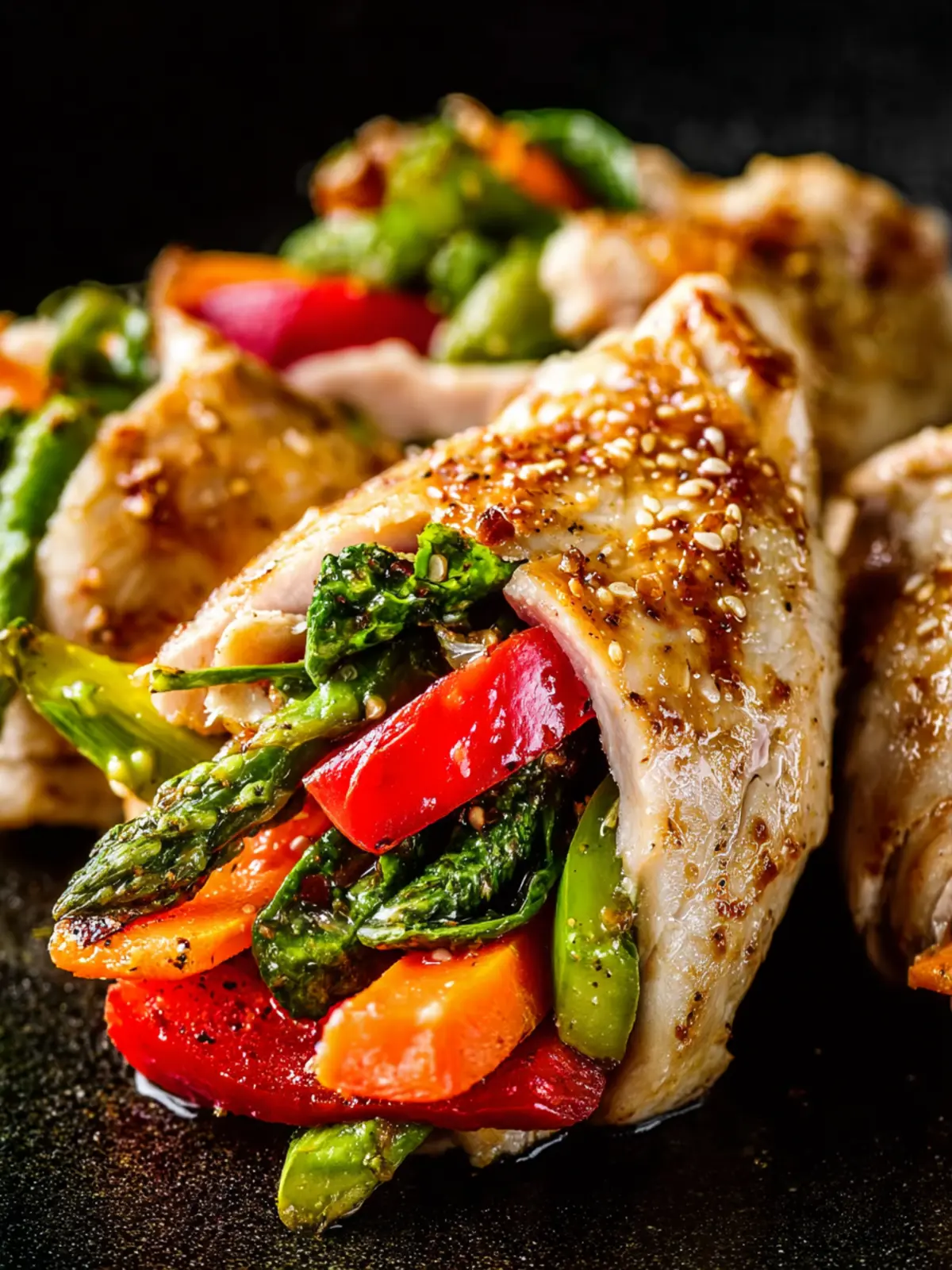 A delicious and healthy chicken roll-up recipe with honey garlic sauce and colorful vegetables.